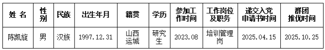 经继教学院工会推优、党员大会投票推荐,继续教育学院支部委员会拟将陈凯旋同志列为入党积极分子人选。根据发展党员工作有关要求,现将其有关情况公示如下: